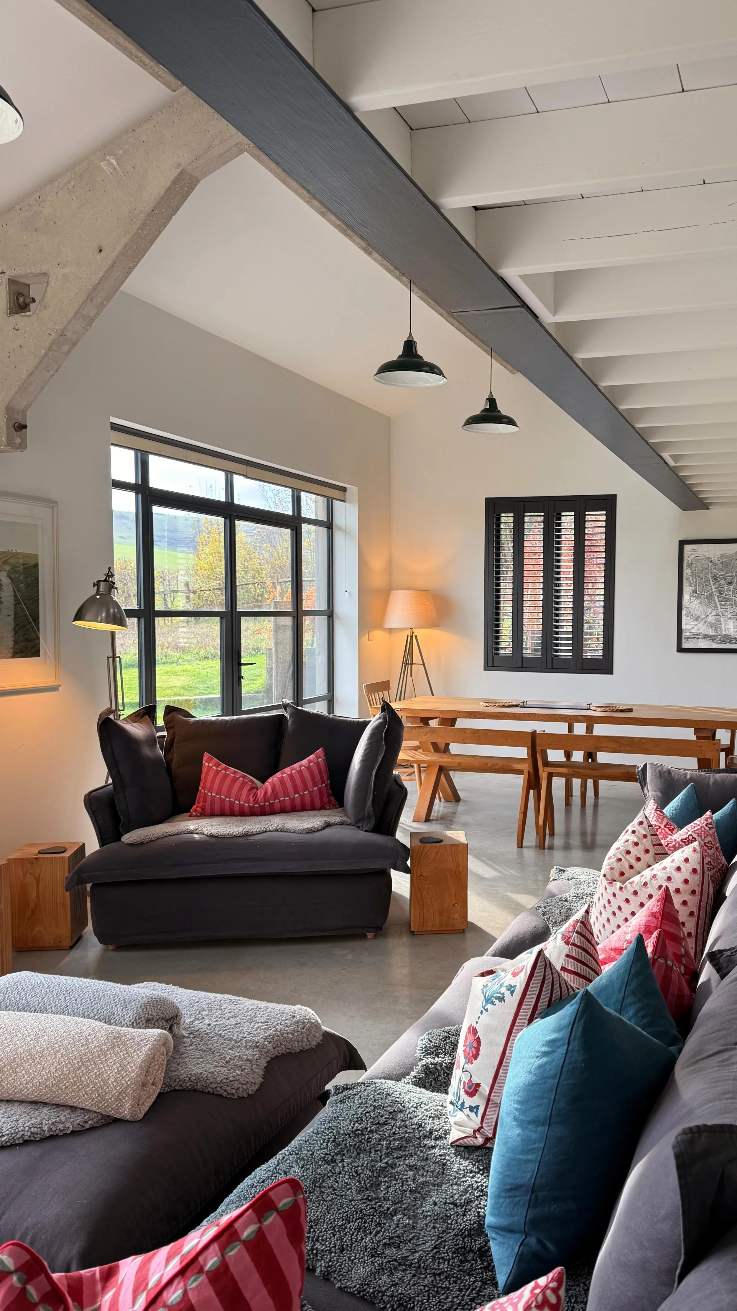 The mezzanine is a cosy, homely space where you can go for a moment of calm. Curl up in those fluffy chairs and lose yourself in a book. Or step outside onto the large terrace and nestle into our corner sofa to enjoy uninterrupted views of the South Downs National Park.
